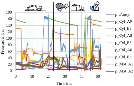 Figure 6 shows the pressure distribution during the cycle recorded at the actuators. The descriptions of the measuring points can be taken from Figure 7. The pictograms illustrate the operations performed by the excavator during this period. Before starting swiveling at a cycle time of approximately 17 s, a rise in the pump pressure p_Pump to a maximum of 170 bar can be seen, without a consumer requesting this pressure. This can be explained by the corresponding actuators moving at a low speed in the digging process. The variable displacement pump possesses a minimum degree of displacement and thus continues to deliver a minimum volume flow of 20 L/min, which is, however, only used to a small extent by the actuators. There is a system-dependent power loss occurs in this section of the cycle noticeable.