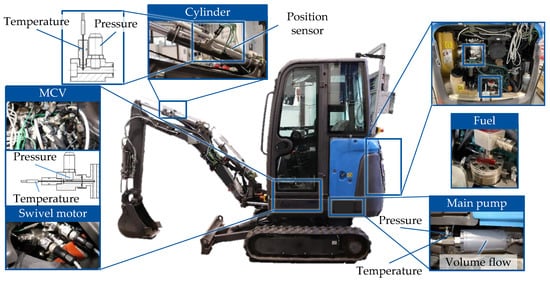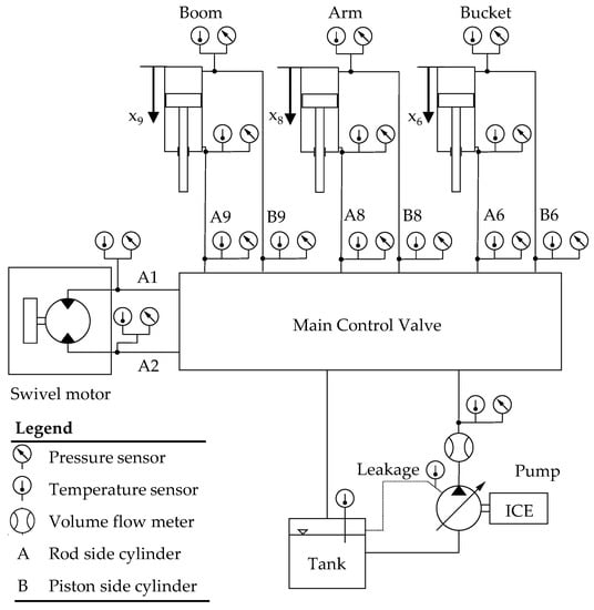 The test excavator is equipped with appropriate measurement devices to record the relevant data. To record the measurement data, a system was set up that allows real-time measurements. For this purpose, the respective terminals for processing the sensor signals were integrated into the measurement chain. The measurement chain was then validated by means of reference measurements. The measurement data was recorded using a data logger. Figure 7 shows the main circuit of the hydraulic system with installed sensors. The main circuit generally consists of three linear actuators: The boom, stick and bucket cylinders. The swivel motor correspondingly drives the slewing gear for swiveling the upper carriage. The diesel engine drives the main hydraulic pump. Other actuators, such as the track motor, are not considered in this study, because they were not activated during the executed test cycle.