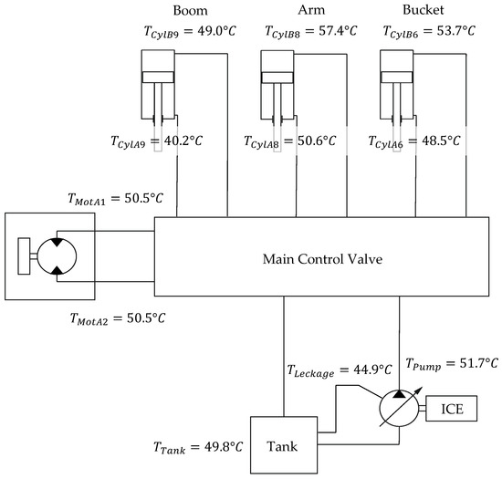 Due to friction and throttling losses that occur in the hydraulic system of the excavator, energy is dissipated in form of heat. This heat is transferred to components of the system and to the hydraulic fluid, which results in a temperature increase. The fluid heating can be described by Equation (4):