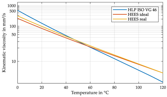 The identification of the temperature enables to infer fluid viscosity, which is significant for power calculation. According to Ubbelohde-Walther the relationship between temperature and viscosity can be described by Equation (5) [22]. The coefficent represents the slope of the straight line in the Ubbelohde-Walther diagram. To identify the slope, two temperatures (;) and kinematic viscosities (; ) of the oil are used in the equation. This formula is used to design the biohydraulic oil to the recorded minimum viscosity of the reference cycle with mineral oil. In their data sheets, the manufacturers of hydraulic oils provide information on the viscosity at 40 °C and 100 °C, from which the slope of the straight line can be deduced and the viscosity at various temperatures can subsequently be calculated. The pressure dependence is neglected in calculations due limited system pressure of 170 bar: