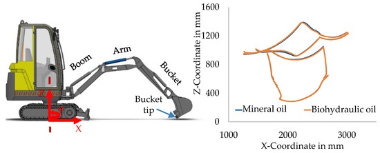 In order to be able to assess the extent of these interference factors, the position of the bucket tip was recorded over the cycle duration. This is calculated accordingly via cylinder lengths. Figure 11 shows the course of the bucket tip in two different cycles. Illustrated is the comparison of two different cycles one with mineral oil-based hydraulic fluid and the other with biohydraulic oil. Both measurements were taken in the same temperature range (). Sufficient accuracy can be achieved when comparing two cycles. The mean value of standard deviation of respective measuring points is 2.8 cm in the X-direction (horizontal) and 1.2 cm in the Z-direction (vertical). This deviation is a more than sufficient value for comparability of different cycles when considering the described interfering factors.