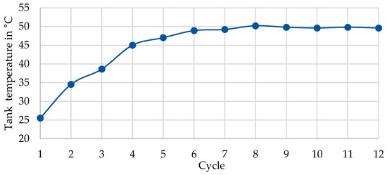An important reference for comparability of measurement results is the fluid temperature. Starting from the hydraulic tank, the fluid is pumped up into the hydraulic circuit by the main pump. For this purpose, the tank’s temperature is set as a reference for comparability of cycles at different temperatures. Figure 12 shows the course of the tank temperature during successive cycles.