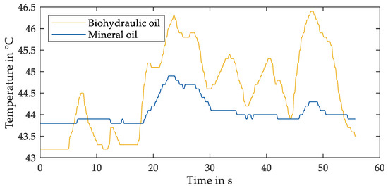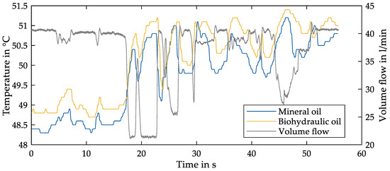 The heating of the hydraulic fluid due to power loss is exemplified by the main pump of the hydraulic system. Figure 13 shows temperature curves of the two hydraulic fluids at the pump outlet and the displacement volume over the cycle time. Both temperature curves were determined from test runs with ambient temperatures of 23 °C. The tank temperatures are identical at 49.8 °C.