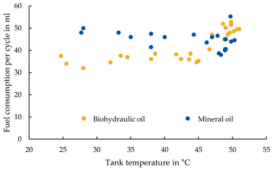 In Figure 14, fuel consumption is plotted against the tank temperature of biohydraulic oil and mineral oil during respective cycles. Especially at lower temperatures (T < 45 °C), the fuel consumption of the mineral oil is higher than the biohydraulic oil. The lower viscosity of the biohydraulic oil is noticeable in this temperature range. Accordingly, the biohydraulic oil causes less hydraulic-mechanical losses (cf. Section 2.2). Fuel consumptions converge in further course of the temperature until an intersection of fuel consumption can be seen at 46.2 °C. From this point on, the fuel consumption of the biohydraulic oil is higher than that of the mineral oil.