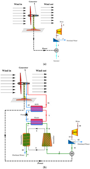 Layouts of the reference system (a), and the hybrid HDH-RO desalination system (b), both driven by a wind turbine.