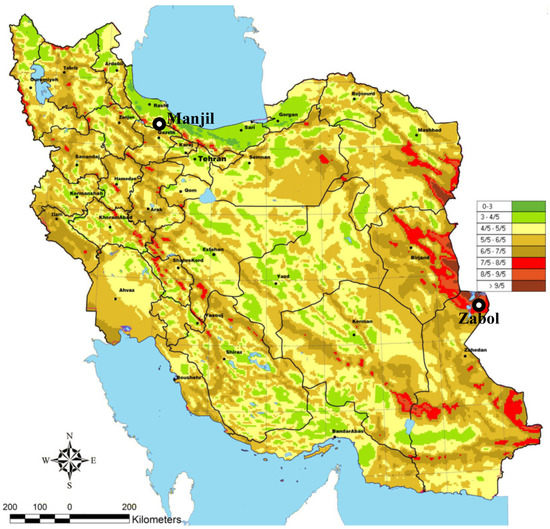 Iran is located in the Middle East and is connected to the Caspian Sea in the north and the Persian Gulf and Sea of Oman in the south. The surface area of Iran is 1,648,195 km2 (ranked as the second-largest in the Middle East and eighteenth in the world) [15]. Based on the Standardized Precipitation-Evapotranspiration Index (SPEI) reported every 10 years, the drought contour for Iran is illustrated in Figure 2. As Figure 2 shows, the majority of regions in Iran experience severe drought due to indiscriminate energy consumption, poor management, and more specifically, a lack of precipitation. The average precipitation is 250 mm/year which is significantly less than the global average (831 mm/year) [15]. In addition to the drought atlas, it is crucial to consider the wind atlas of Iran before selecting the case study locations for the devised hybrid desalination system’s working wind turbine. The wind atlas of Iran for a height of 100 m must be considered, since in the simulation a wind turbine with a GW-136/4.8 model and hub height of 86 m is selected (the nearest altitude to the height of the hub). Figure 3 displays the wind atlas of Iran. As Figure 3 indicates, the east of Iran has strong wind potential, while some parts in the north and northwest suffer from a lack of wind speed. In addition to the wind speed potential and drought, it is highly imperative to consider the seawater availability in the selection of the case study’s location, to provide ample seawater feed for the devised system. Considering all these factors on the ground, the two locations of Manjil and Zabol were chosen, to satisfy all factors simultaneously. The location of each city is presented in Figure 2 and Figure 3 with blue stars. Manjil is located in the north of Iran in the province of Gilan, at a distance of around 80 km from the Caspian Sea. The average wind speed of Manjil in the winter is 6 m/s (at an elevation of 40 m). Manjil experiences strong north winds with an average speed of approximately 14 m/s between May and September [16]. The average precipitation of Manjil is 216 mm/year, while the average precipitation of Gilan province is 1048 mm/year [17]. Zabol lies on the east of Iran and north of Sistan-Baloochestan province, and borders Afghanistan. Due to the dry and hot climate of Zabol, with long summers, the city suffers from a severe lack of drinkable water for most days of the year. The annually averaged wind speed of Zabol is about 7.5 m/s, where the wind intensity is high from April to October. In addition, the average precipitation of Zabol is about 70 mm/year, which is extremely low compared to that of the whole country (250 mm/year). Currently, Zabol is facing drinkable water shortages due to the lack of precipitation as well as the high salinity of groundwater. The geographical coordinates of the selected cities are presented in Table 2.