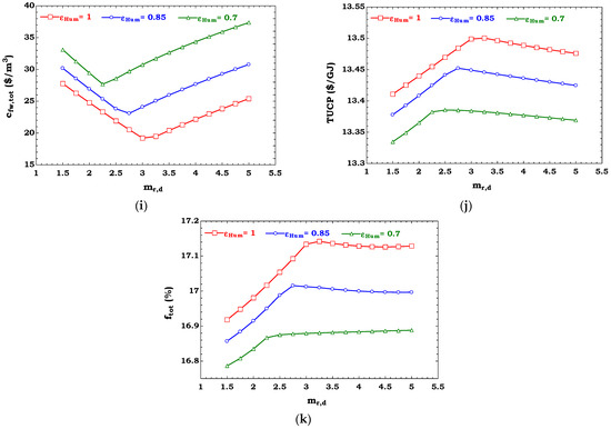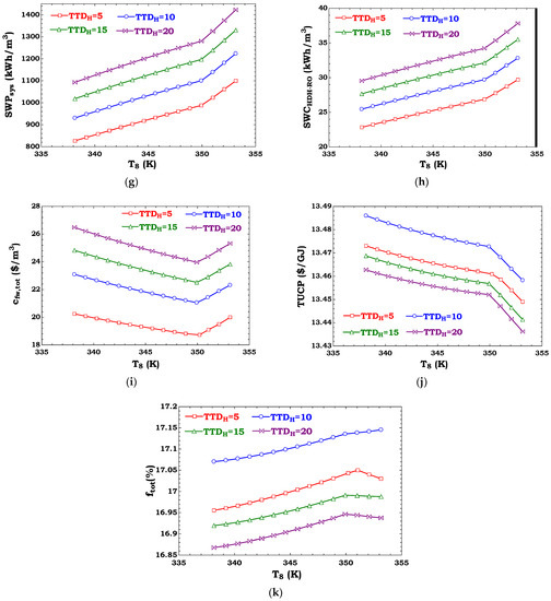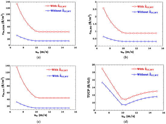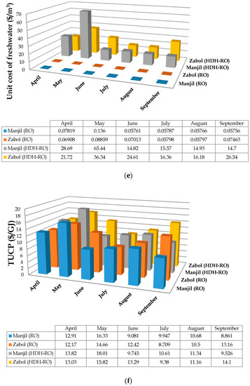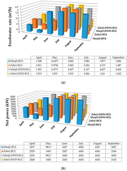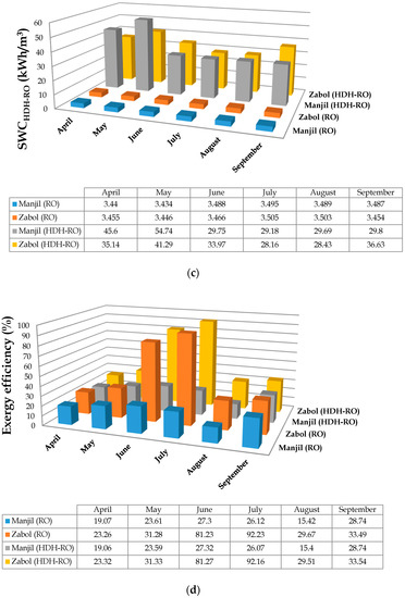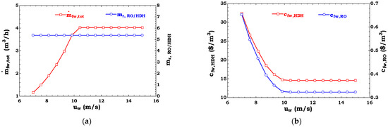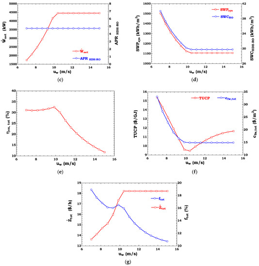 Table 7 lists the results of the performance and cost evaluation of the HDH-RO unit driven by both thermal energy and power from different wind turbines, and compares these results with those obtained by the simulation of an RO unit under a constant net power fed to the RO module (). These quantitative results are extended to different wind speeds ( and ).
