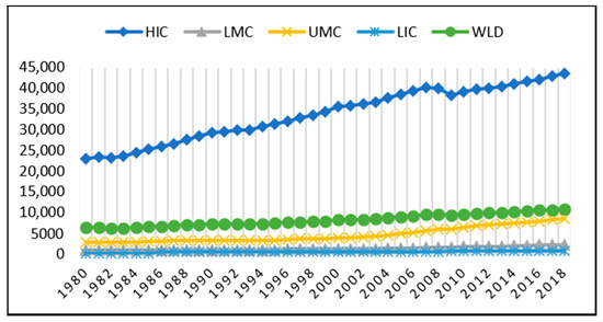 The graph demonstrates the income difference of different economic groups in comparison to aggregate world income. HIC = high-income counties; LMC = lower-medium countries; UMC = upper-medium countries; LIC = low-income countries; WLD = world aggregate income.