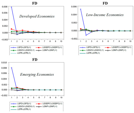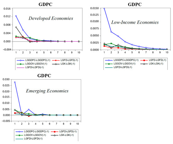 Figure 2 visualizes the combined reaction of GDP per capita to all shocks in model 10 for all three groups. The GDPC had a much larger and more persistent response to GDPC innovation, especially in developed and low-income economies, and remains transitory in emerging economies. The markets of developed economies are more efficient and their investors quickly respond to the information. Positive signals of previous GDP encourage investors to participate in capital formation, which further contributes to current GDP [32]. While in the case of low-income economies, high investment risk restricts their access to maximize investment and other alternatives to improve current GDP. Meanwhile, in emerging economies, other factors such as FDI and debt financing also contribute to current GDP [33]. Simultaneously, FD’s positive shock increases the GDPC (through the enlarged flow of funds by the banking sector and financial market to the economy) for the next two years in developed and emerging economies. However, this has a more continual impact on low-income economies and affects their performance for the next five years. The prolonged impact of FD shocks in low-income economies as compared to others can be explained as the attached high investment risk condense flow of funds from the banking to the private sector. Only projects with high success rates and lower risk can qualify, which ultimately increases FD effectiveness and prolongs impact in low-income economies [34]. A similar positive effect of financial development on economic growth has been studied by [20,35,36], while [37] analyzed the transitory nature of the impact of FD in emerging economies. However, [38] suggests no causality relationship between FD and economic growth.