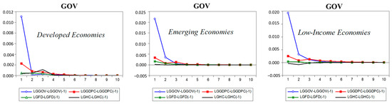 The combined reaction of national governance to the explanatory variables of model 12 is presented in Figure 4. The immediate response of national governance to innovation is much higher, but temporary for all types of economies. A positive per capita output shock has a more persistent impact on governance and influences it in a monotonic fashion. This implies that with increased levels of income comes improvements in national governance performance, meaning that one of the root causes of ineffective governance and corruption can be low levels of income, especially in low-income economies [49]. However, increases in GDP lead to improved aggregate income which ultimately reduces corrupt practices and improves governance. However, Ref. [50] revealed that economic growth does not promote better governance practices, while good governance can endorse economic growth. Moreover, human capital amazingly impacts national governance positively in developed economies and negatively in low-income economies. This indicates that developed economies consistently update their education system and apply innovative techniques to improve its quality [51]. However, the education systems of low-income economies remain opposed to this strategy. Meanwhile, this has no significant role in the national governance of emerging economies. Besides this, financial development plays no significant role in national governance and seems to be a less important factor for governance in all three types of economies, confirming that there is no direct relation between financial development and governance.
