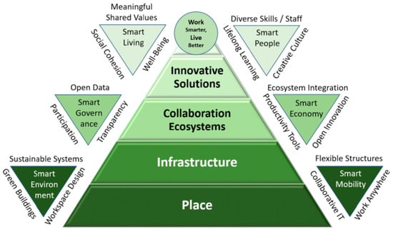 Nonetheless, the ‘ecosystem’ has a wide spectrum of interpretations varying from its technical to the more human-oriented and social approaches toward a ‘smart’ urban transformation [15] aiming at the benefits of the QoL and the long-term and ‘intelligent’ city development [16]. To better visualize the design and implementation of ‘smartness’ through more tangible results, Appio et al. [6] organized Giffinger’s typical ‘smart’ model of the six pillars following the model of Hutchinson’s pyramid (Figure 2):
