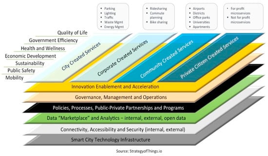 From the other side, Ooms et al. [3] conceptualize the term ‘ecosystem’ along with: (1) the ‘smart’ attributes, including the different stakeholders, (2) the governance, and (3) the necessity of being ‘sustainable’ in long-term horizons. Chan [21] describes the SSC as ‘an ecosystem comprised of people, organizations, policies and processes towards desired outcomes—a city adaptive to its environment and responsive to technological evolution to accelerate and to facilitate its actions’, in which sustainability is prioritized. Figure 3 represents the ‘smart city’ model in ‘layers’ organization, in which each has a particular role for the accelerating integration of the technology to mutate the ecosystem. This process is usually supported by the synergies between stakeholders, while a key factor for its success is undoubtedly the ‘governance’.