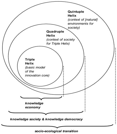 The Quintuple Helix Model of innovation adds a fifth dimension to the innovation processes, with the emphasis on the nature and social ecology [56]. Nonetheless, a question, which usually remains unsolved within the Quintuple Helix model, is the way to connect the five helices in an innovation process. To this topic, Markard et al. [57] argue that a response is around the ‘ecology’, which is the interdisciplinary either of relations between living organisms (social) or either between them and their environments (natural), which is subsumed as an ‘ecosystem’. All these concepts around the Quintuple Helix Model converge in the society–nature transition. Thus, in the Quintuple Helix, the focus is around the translation of the environmental and ecological issues by identifying them as ‘drivers’ for future knowledge and innovation.