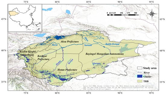 Study area and the Tarim River Basin (TRB) (the study area consists of Bayingol Mongolian Autonomous Prefecture, Aksu Prefecture, Kizilsu Kirghiz Autonomous, Kashgar Prefecture, Hotan Prefecture, formed by merging country boundaries).