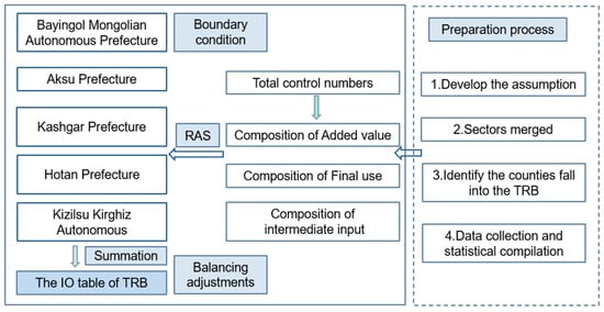 A regional IO table is the prerequisite for use of IO analysis, but an IO table of the watershed scale is always unavailable because official statistics are only provided based on the administrative unit (provincial scale) [56]. Generally, constructing a regional IO table uses two main methods, namely, survey and nonsurvey approaches [55], the former of which is generally expensive and time consuming. To address this issue, some studies have used a combination method to compile IO tables [57,58]. In this study, we used the partial survey approach to compile the IO table with 18 sectors of TRB in 2012 (Table A1). This technique requires less information than that usually obtained in survey-based IO tables. Firstly, a preparation process is needed (Figure 2, dotted box).