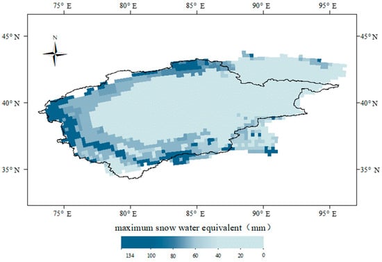 Over the whole basin, the annual total snow meltwater in 2012 (402.86 × 108 m3) was calculated from the annual maximum SWE in the TRB (Figure 3). The results showed that the total amount of available water resources provided by snowmelt runoff in TRB was 120.86 × 108 m3. Meanwhile, it was calculated that the total amount of available water resources provided by glacier runoff in TRB was 121 × 108 m3 in 2012.