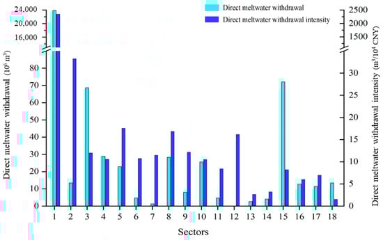 Direct meltwater withdrawal and intensity of TRB’s various sectors in 2012 (the explanation of the sector code is shown in Table A1).