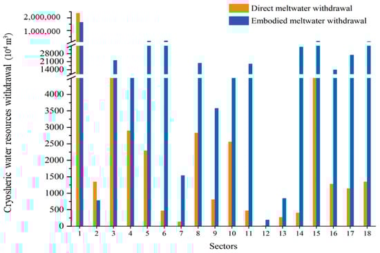 The direct and embodied meltwater withdrawal of TRB’s various sectors in 2012 (the explanation of the sector code is shown in Table A1).