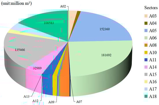 Meanwhile, the DMW and EMW of A02 (mining and washing of coal) were 13.47 million m3 and 7.81 million m3, respectively, which represented a total of 5.66 m3 of virtual water transferred to other sectors in the form of products (Table 2). Except for A01 (agriculture) and A02 (mining and washing of coal), the EMW of other sectors was greater than that of DMW.