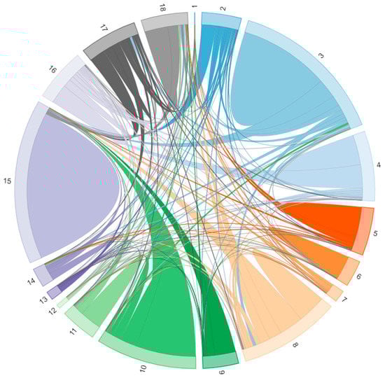 Cryospheric virtual water was transferred through trade among different sectors, which significantly influenced the water use responsibility of the region. Based on our calculation (Table 2), EMW and DMW of A01 (agriculture) were 166.17 × 108 m3 and 238.62 × 108 m3, respectively, and net virtual water transfer (NVW) amounted to 72.45 × 108 m3 in 2012, accounting for 29% of total cryospheric water resources in TRB. To identify which sectors received virtual water from A01 (agriculture), we constructed a virtual water transfer relationship (Figure 6). The results show that most virtual water resources were transferred to industries such as A06 (manufacture of textile), A05 (processing of food), A15 (construction), A18 (other services), and A14 (other manufacture).