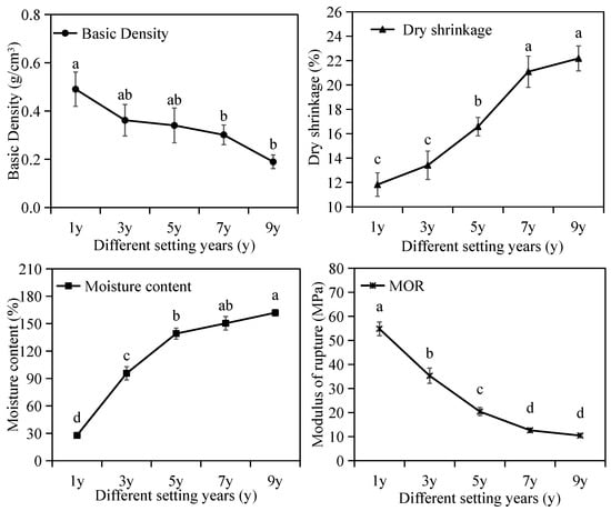 The MOR of a natural biomaterial is the most important mechanical property in its resource utilization [20]. As shown in Figure 2, with the increase in setting years, the MOR index showed a downward trend, and the decline was rapid at first and then slowed. After setting for seven years, the MOR decreased by 76.95%. As the water content of the S. psammophila sand barrier increased in this interval, the dimensional stability of the sand barrier changed, as did the performance of the sand barrier, and thus the mechanical properties of the S. psammophila sand barrier decreased. When the setting years exceeded seven years, the downward trend in the MOR curve declined.