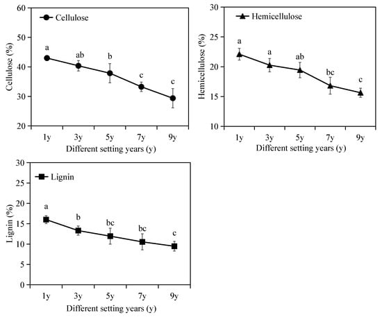To elucidate the changes in the chemical composition of S. psammophila sand barriers after long-term use, quantitative analysis of the chemical composition of S. psammophila sand barriers was carried out. The sand barriers are mainly composed of cellulose (skeleton material, providing strength), hemicellulose (adhesive material, providing shear resistance), and lignin (filling material, providing hardness), which affect the ability of S. psammophila sand barriers to prevent wind and fix sand [21]. The contents of cellulose, hemicellulose, and lignin in the sand barriers showed a decreasing trend with the increase in setting years (Figure 3). According to variance analysis, there were significant differences in the content changes of the main chemical components of the S. psammophila sand barriers with different setting years, and there was a certain coordination relationship (p < 0.05).