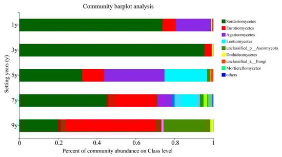 As shown in Figure 4, species information of 20 classes of fungi were annotated in the sand burial samples from different years. The average relative abundances of Sordariomycetes, Eurotiomycetes, Agaricomycetes, Leotiomycetes, c__unclassified_p__Ascomycota, Dothideomycetes, p__unclassified_k__Fungi and Mortierellomycetes were 53.75%, 19.78%, 11.65%, 7.21%, 5.60%, 0.85%, 0.52%, and 0.45%, respectively. The sum of the relative abundances of species accounted for 99.81% of the total abundance. The species abundance ratio of Sordariomycetes in the samples set for one and three years was higher than that in the samples set for five, seven, and nine years, while the relative abundance ratio of Eurotiomycetes exhibited the opposite pattern. Leotiomycetes accounted for the largest proportion after five years of setting, with a relative abundance of 21.93%, while Leotiomycetes accounted for the lowest proportion at one year and three years of setting, with a relative abundance of 0.01% and 0.03%, respectively.