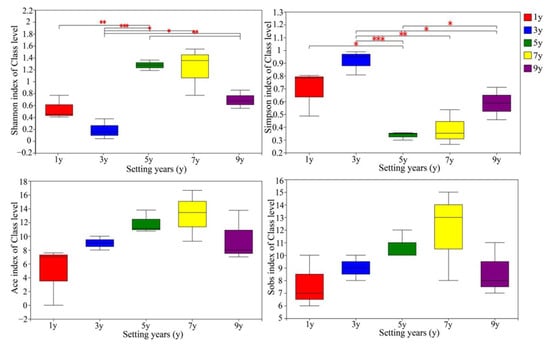 The Shannon index and Simpson index were used to reflect the diversity of the fungal community, while the Sobs index and Ace index were used to reflect the richness of the fungal community. The statistical results of the Alpha diversity index (as shown in Figure 5) showed that the Sobs and Ace indexes of the fungal community with different setting years showed a trend of first increasing and then decreasing with the increase in setting time. The Shannon index ranged from 0.19 to 1.27, and there were significant differences in the Shannon index values among groups of different years (p < 0.05), whereas there were no significant differences in the diversity between one year of installation and three, five, and seven years of installation (p > 0.05). The Simpson index values ranged from 0.33 to 0.92 for different setting years of S. psammophila sand barriers, and the Simpson index of community dominant degree setting for three years was significantly different from that of five, seven, and nine years (p < 0.05).