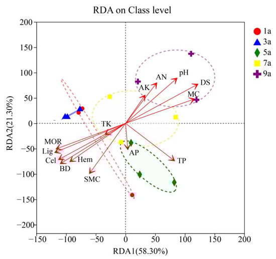 RDA analysis of fungal community structure and microenvironmental factors at different years. Notes: Lig, Lignin; Cel, cellulose; Hem, hemicellulose; BD, basic density; SMC, soil moisture content; MOR, modulus of rupture; TK, total potassium; TP, total phosphorus; AP, available phosphorus; AK, available potassium; AN, soil alkali-hydrolyzable nitrogen; DS, volume dry shrinkage; MC, moisture content of sand barrier sample.