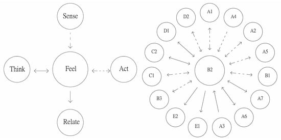 Summing the DEMATEL and D-ANP rankings of each criterion provides the overall ranking of the criteria as shown in Table 8 and Table 9. The smaller the total score of sorting, the more important it is to represent the extent of its influence. Based on the first half of the ranking, the selected key criteria include: pleasure (B2), interactivity (D1), recognizability (E2), variation (A6), naturalness (A3), and associability (C2), Sociability (E1), and Stewardship (A7) In total, eight key criteria are those affecting rural tourists’ aesthetic experience satisfaction. Among the key criteria, the emotional experience dimension accounts for one, the action experience dimension accounts for two, the related experience dimension accounts for one, and the sensory experience dimension accounts for two, this means that the sensory experience dimension needs more attention than the thinking experience dimension.