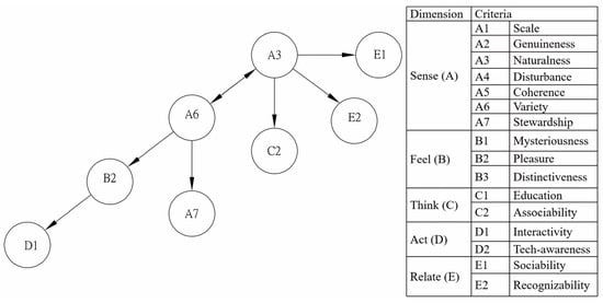 As shown in Table 6 and Table 7, the (d + r) value of “emotional experience” and “pleasure” criteria are the largest, which is the central influencing factor; the “sensory experience” dimension and the “naturalness” criterion have the largest (d − r) values, which are important leading factors; while the (d − r) values of the “relevance experience” dimension and the “recognizability” criteria are the smallest, and are most influenced by other criteria that belong to the result factors.