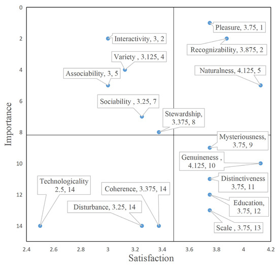 The main purpose of IPA is to examine indicators that need to be improved, maintained continuously, paid too much attention, or do not need to be paid attention to in terms of the performance value and relative importance of the criteria. In the satisfaction questionnaire of this study, some criteria have multiple related questions in order to analyze the specific situation more deeply. The satisfaction of each criterion in Table 11 refers to the overall average score for that criterion. After discussion with the interviewees, it was agreed that the total average score for each criterion plus the total average score of 3.5 points should be taken as the critical value for whether the performance is satisfactory or not. This study constructed an analysis matrix of importance and performance value with two dimensions of importance and performance value, in which the importance is ranked by the Borda score; the lower the score, the higher the importance. The performance value was calculated according to the results of the interviewees’ questionnaire (scoring the performance of each item with 0–5). As shown in Figure 4, a performance value of above 3.5 points for a criterion represents good performance (i.e., scale, genuineness, naturalness, mysteriousness, pleasure, distinctiveness, education, recognizability), which should be maintained continuously, and a criterion scoring below 3.5 points needs to be improved. The average performance for the emotional experience and action experience dimensions shown by Table 11 are 3.75 and 2.75, respectively, so the emotional experience dimension is better than the action experience dimension.