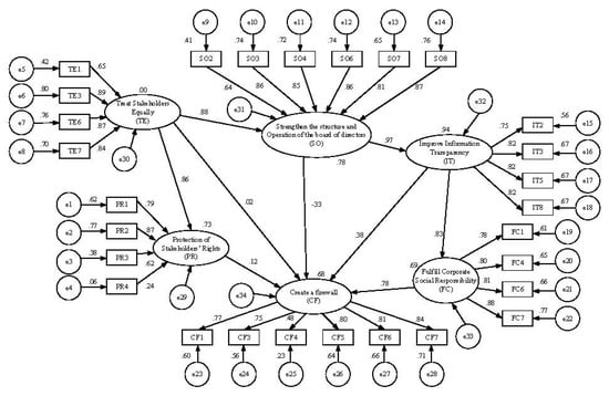 Path analysis using AMOS was carried out to verify whether the hypotheses were valid or not, as shown in Table 6. H1, stating that there is no significant relation between setting up a firewall and shareholder protection, did not stand. This was also sustained for H2, which did not stand. Equitableness to all shareholders is not necessarily equal to firewall set up. H3 was rejected as well, which indicates a similarity in viewpoint from H1 and H2. There is not necessarily a link among the board of directors, firewall, and shareholders in terms of sustainable corporate governance for top engineering consulting companies. The verification of H4, related to the promotion of information transparency associated with setting up a firewall, was not significant. There is not a close relationship between these two in relation to improvement in sustainable corporate governance. The remaining hypotheses, H5 to H9, are all positively related to engineering consulting corporate governance. They state that equitableness to all shareholders is one of the keys for successful corporate governance since it significantly connects shareholders’ interests with the operations of the board of directors. Additionally, information transparency is the other key to mastering sustainable corporate governance for Taiwan’s top engineering consulting companies. Figure 2 illustrates the SFM results. It can be seen that only 28 out of 46 factors influence sustainable corporate governance for engineering consulting firms in Taiwan. Entering these 28 factors for factor analysis, we can obtain the preference ranking shown in Table 7.
