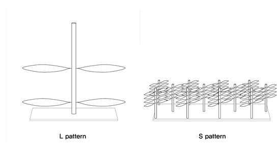 In this article, to experiment, we created two groups: tree-like structures, with identical surface areas and individual leaf shapes, and micro-morphology, but with differences in leaf sizes and clustering patterns. We created a group of 4 sparsely arranged large leaves and a group of 96 closely arranged small leaves. The overall surface areas, individual leaf shapes, and leaf micro-morphology were the same. The size and number of individual leaves differed, forming a large sparse pattern (hereafter L pattern) and a small and dense pattern (hereafter S pattern). For both patterns, the total area of the leaves was 38,552 mm2. In the L pattern, the surface area of a single leaf was 9638 mm2. There were four leaves per stem, and the pattern consisted of one stem with four leaves. In the S pattern, one leaf had an area of 401.583 mm2. There were eight leaves per stem, and one pattern consisted of 12 stems. The S pattern had 96 leaves in total. Figure 1 demonstrates the area of the L pattern and S pattern samples, and Figure 2 demonstrates the shapes of L pattern and S pattern samples when fabricated into the tree like structures.