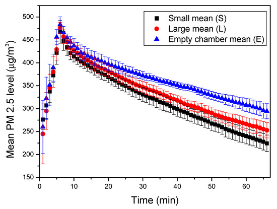 Table 1 shows that the reduction is more significant when the S pattern is in the chamber than when it is empty. After 10 min, the average decrease rate of PM2.5 compared to the maximum level was 17.5%, 16.8%, and 15.2%, for the S pattern, L pattern, and empty chamber, respectively. There was a 1% or 2% reduction rate difference between the S pattern and the L pattern and the S pattern and the empty chamber, respectively. After 30 min, the average decrease in PM2.5 particles compared to the maximum level was 33.2% for the S pattern, 30.6% for the L pattern, and 25.7% for the empty chamber, indicating that the difference between the S pattern and the L pattern was about 3% and the S pattern and the empty chamber about 8%. Finally, after 60 min, the average decrease in PM2.5 level compared to the maximum level was 52.0% for the S pattern, 46.9% for the L pattern, and 39.1% for the empty chamber, showing a difference of about 6% between the S pattern and the L pattern and about 13% between the S pattern and the empty chamber. In other words, the difference in PM2.5 reduction rates between the S pattern, L pattern, and the empty chamber increased with time.