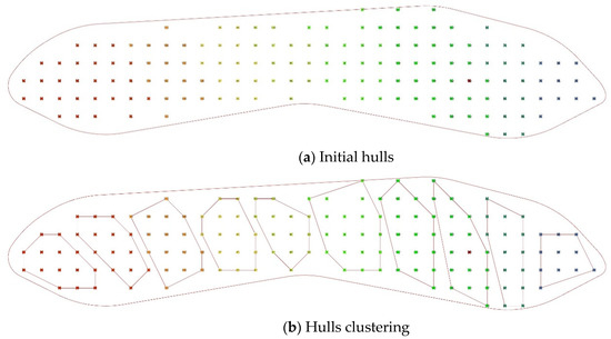 Secondly, several methods were tested to cluster points in a generic floor plan based on numerical attributes (i.e., radiance values). Radiance values were assigned to each point in a regular grid within the plan outline and different machine learning models were tested to achieve the best prediction. The method that resulted in a more promising result has been the Gaussian Mixture [21]. The points inside the plan outline were used as an input and pre-set the number of clusters wanted. The Gaussian mixture algorithm provided the likelihood and probability that any given point was assigned to a certain cluster, as well as the overall prediction (expressed as an integer). As this method allowed determining the number of desired clusters in advance, a possible number of groups was tested reflecting the number of apartments needed as per brief. A convex hull method [22] was used to generate a polyline around the bound of each cluster. Figure 3 illustrates the generation of the hulls (Figure 3a) around each cluster (Figure 3b).