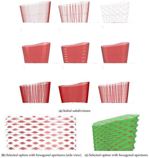 Thirdly, several methods were explored to help sub-diving the building envelope in order to generate a panelling for the façade with a window wall ratio (WWR) = 0.2. This has been achieved by working with several sub-division methods directly in Grasshopper, using surface subdivision and calibrating the domains for each segments of the façade. Several methods built in Lunchbox [23] were also tested as shown in Figure 4a, and eventually hexagonal apertures (Figure 4b,c) were chosen.