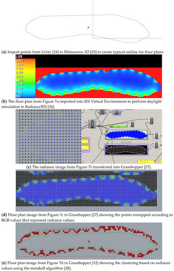 First, the optimum form for solar exposure was developed using self-organisation of building blocks, constrained in the depth to achieve a shallow plan depth of not more than 6 m from windows. The building blocks were first initiated randomly (Figure 5a), and were made to multiply so that each building block would be copied into two, analogously to biological cell division, whilst being exposed to a repellent gravitational force emanating from a representation of the sun (Figure 5b) within Unity Game Development Platform [24]. That led to a creation of a concave south-facing form (Figure 5c), where the colour of building blocks goes towards green when closer to the representation of the sun and towards red when further away from the representation of the sun.