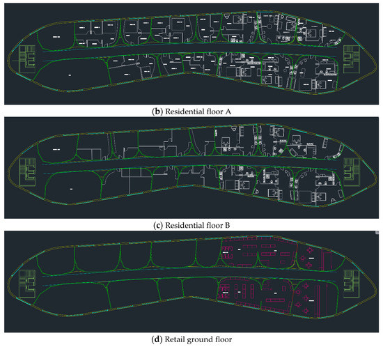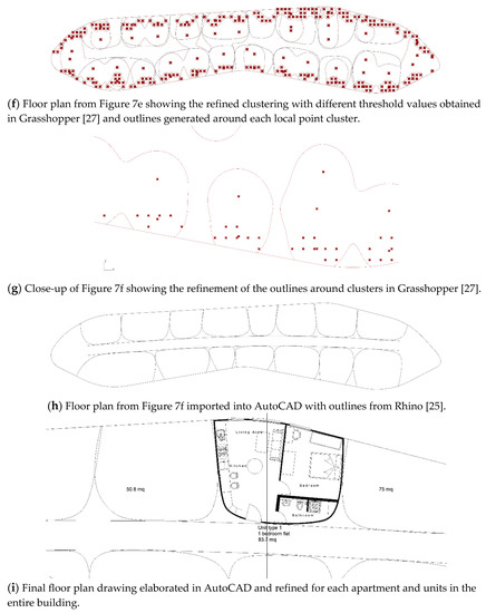 The threshold values were set out in order to obtain clusters where boundaries were not intersecting (Figure 4g). The clustering was then optimised, finally obtaining the layout for each apartment in residential floors, shops and the other required areas (Figure 7h,i).