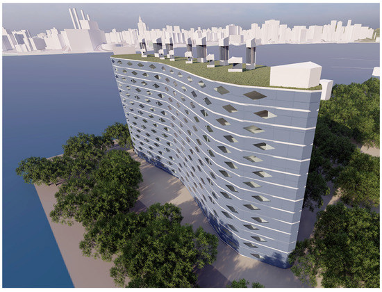 The organic shapes in the core of the floor plate (Figure 7h) create passive ventilation stacks/light wells that can be seen above the roof level in Figure 8, and extend all the way to the ground floor, thus providing natural ventilation and natural daylight. The tops of passive stacks are glazed and from the south side with dark internal surfaces opposite the glazing, in order to increase solar absorption on top of the stacks and, thus, increase the air buoyancy to drive the stack ventilation. The building outline superimposed on the site satellite image is shown in Figure 9.