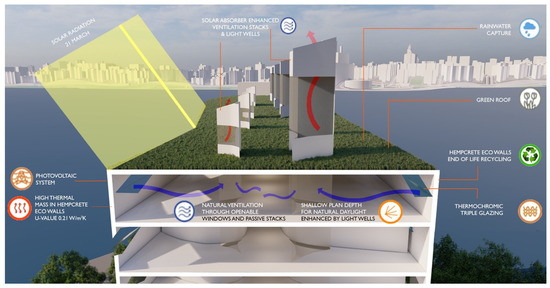 A shallow plan depth that maximises natural daylight and natural ventilation is the basis for the BioZero design, and evolved, as introduced in Section 2. Concave south-facing façade ensures maximum solar capture. Window to wall ratio of 0.2 reduces excessive solar gains in summer and heat losses in winter. Inner light wells/ventilation stacks in combination with external glazing ensure that natural daylight and natural ventilation are maximized. Daylight sensitive dimming of LED electrical lights (daylight following) is specified for reduced energy consumption. Hemp-lime bio-composite material for external/internal walls smooths out temperature and relative humidity fluctuations and achieves negative embodied carbon. Reversible water source heat pump with heated/chilled beams is specified and uses water from East River as energy source. Cadmium Telluride (CdTe) photovoltaic array is specified, covering 90% of the opaque surface of the south-facing façade and represents 3367 m2 of on the south-facing surface. Green roof with water capture was specified to reduce temperature fluctuations on the top floor, and to restore the ground footprint lost to the construction of this building, whilst harvesting water for toilets flushing.
