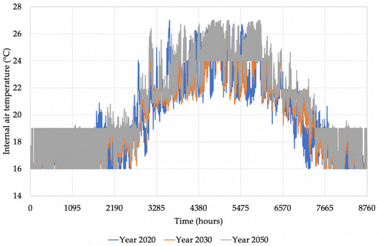 As hempcrete material reduces internal temperature and relative humidity fluctuations, reported in [18,32,36,37], the future climate extremes will be dampened by the building and will provide a climate refuge to the building occupants.