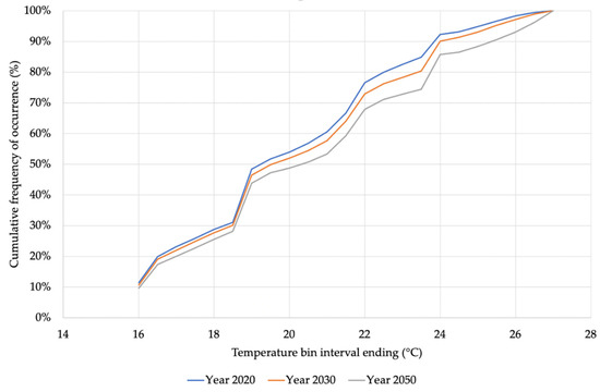 Cumulative frequency of occurrence of internal air temperatures in a south-facing apartment.