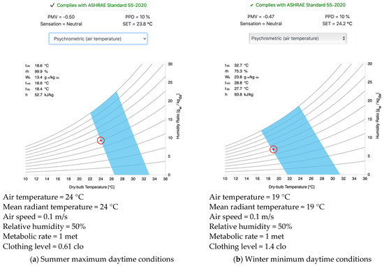 The daytime temperature range was subsequently run through ASHRAE Standard 55-2000 [42] and the results are shown in Figure 15. As can be seen from this figure, thermal comfort is achieved within 10% predictive percentage of dissatisfied (PPD), in both the summer and winter. A critical adaptation factor between the seasons is the clothing level, which shows that occupants have a part to play in ensuring zero carbon performance, thus adapting the clothing between 0.7 clo in the summer and 1.4 clo in the winter. This can be achieved by different clothing ensembles, as detailed in [42].