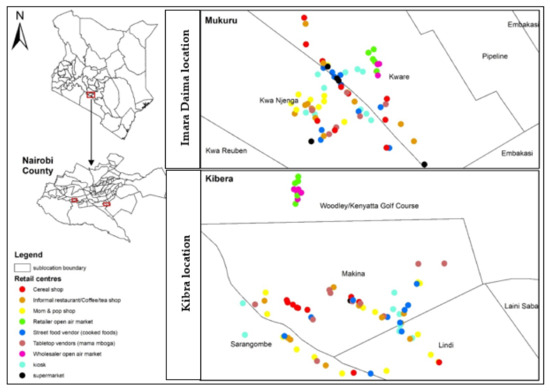 Figure 1 presents the study outlets in the two study locations (Imara Daima and Kibra). The different types of outlets are presented in different colours and positioned on the map using their Global Positioning System (GPS) coordinates.