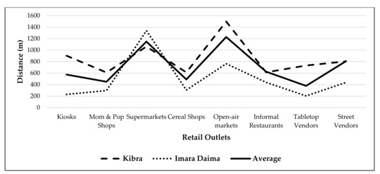 Higher MLDS scores for mom-and-pop shops had a positive and significant association with HDD generally and dietary quality for women. Higher MLDS at informal restaurants also had a positive and significant association with HDD. Although supermarkets are often much more diversified than traditional outlets, we did not observe any significant association between supermarket MLDS and either household or individual dietary diversity. In fact, they had a negative influence on HDD and the dietary quality of women and children. The urban poor rarely purchase their food from supermarkets [36]. As a result, the diversity of products offered in these outlets is not reflected in resource-poor households’ dietary diversity. Furthermore, supermarkets were located farther away from households than other outlets (Figure 2).