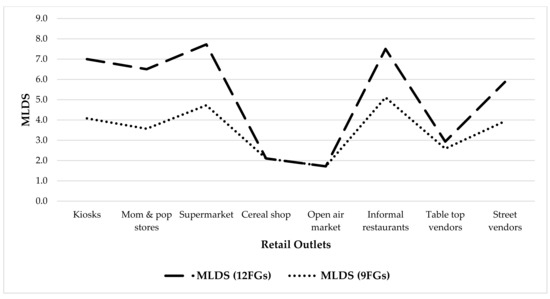 To understand the availability of food in the sampled outlets, we computed the MLDS, which shows dietary options for consumers. In computing the MLDS we used both 9 and 12 food groups to assess market situation when all food groups (12 FG) and only the more nutritious foods are considered (9 FG). MLDS utilizes a food-group categorization similar to the HDDS. As expected, supermarkets had the highest MLDS (Figure 3), a finding that is consistent with literature on the expansion of supermarkets in low- and middle-income countries [13,14]. Cereal shops, open-air markets, and tabletop vendors offered the least diversity, with MLDS scores of less than three food groups. Mom-and-pop shops and kiosks offered almost equal levels of food diversity. These trends were unchanged even when excluding the less nutritious food groups: sweets and sugars; oils and fats; and spices, condiments and beverages. However, while cereal shops, open-air markets and tabletop vendors generally stocked low diversity (Figure 3), they also had few offerings from the sweets and sugars, oils and fats, and spices, condiments and beverages groups, all of which make minimal contributions to micronutrient density. Despite the high MLDS in supermarkets, evidence shows that the use of supermarkets is positively associated with income; the urban poor do not regularly patronize them [15,17,23,36]. Kiosks and mom-and-pop shops, second only to supermarkets in terms of MLDS, are more common in poor urban neighbourhoods, and could therefore be used to deliver healthy dietary options among the urban poor.