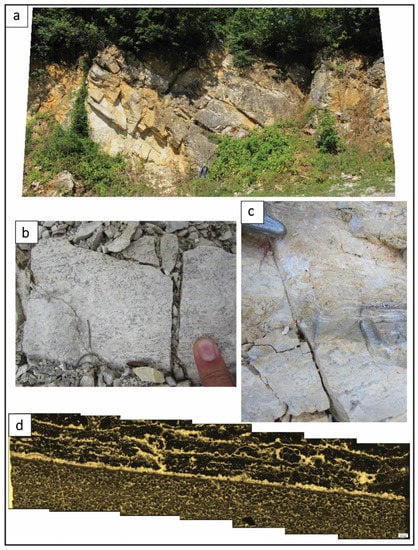 Representative outcrop and lithofacies types of the Upper Triassic dolomites from Žumberak Mts. (a) The outcrop of the Main Dolomite Formation; (b) sample of fenestral dolomite facies of the Main Dolomite Formation; (c) sample of stromatolite facies of the Main Dolomite Formation; (d) transition from peloid dolomite to fenestral dolomite lithofacies.