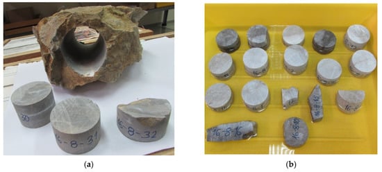 Effective porosity is the ratio of the volume of pores (joined so fluids can migrate within them) to the total volume. It was determined by a method recommended by the International Society for Rock Mechanics and Rock Engineering (ISRM). It measures the effective porosity, dry matter density, and rock sample properties that are irregular in geometry for geomechanical purposes but can be applied to samples with the correct geometry (Figure 3b). The method is used only for rocks that do not swell when immersed in water and do not disintegrate when dried [64].