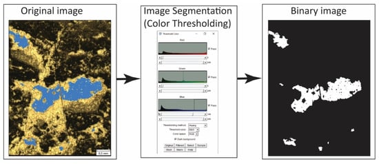 Epoxy impregnated thin sections were used where the epoxy resin was impregnated into pores [65]. Blue dye of epoxy resin is very easy to distinguish from the rock mass, so the pores are highly visible (Figure 4). Image analysis provides a relatively fast method for directly obtaining porosity measurements and various geometric parameters of pore shape [46]. Image analysis was performed in ImageJ software [66,67,68] with two plugins: Biovoxxel [69,70] and Fraclac [71]. Image process analysis begins with image preparation to emphasize differences between pores and rock mass, so the algorithms used in the next phase of image processing can have better accuracy. Image preparation consisted of manual setting up of the brightness, contrast, and color balance to enhance the contrast between pores and rock mass. The used microphotograph images are color images, so there were two possible methodologies of image segmentation: (a) converting color images to grayscale then thresholding to obtain binary images and (b) color thresholding (Figure 4).